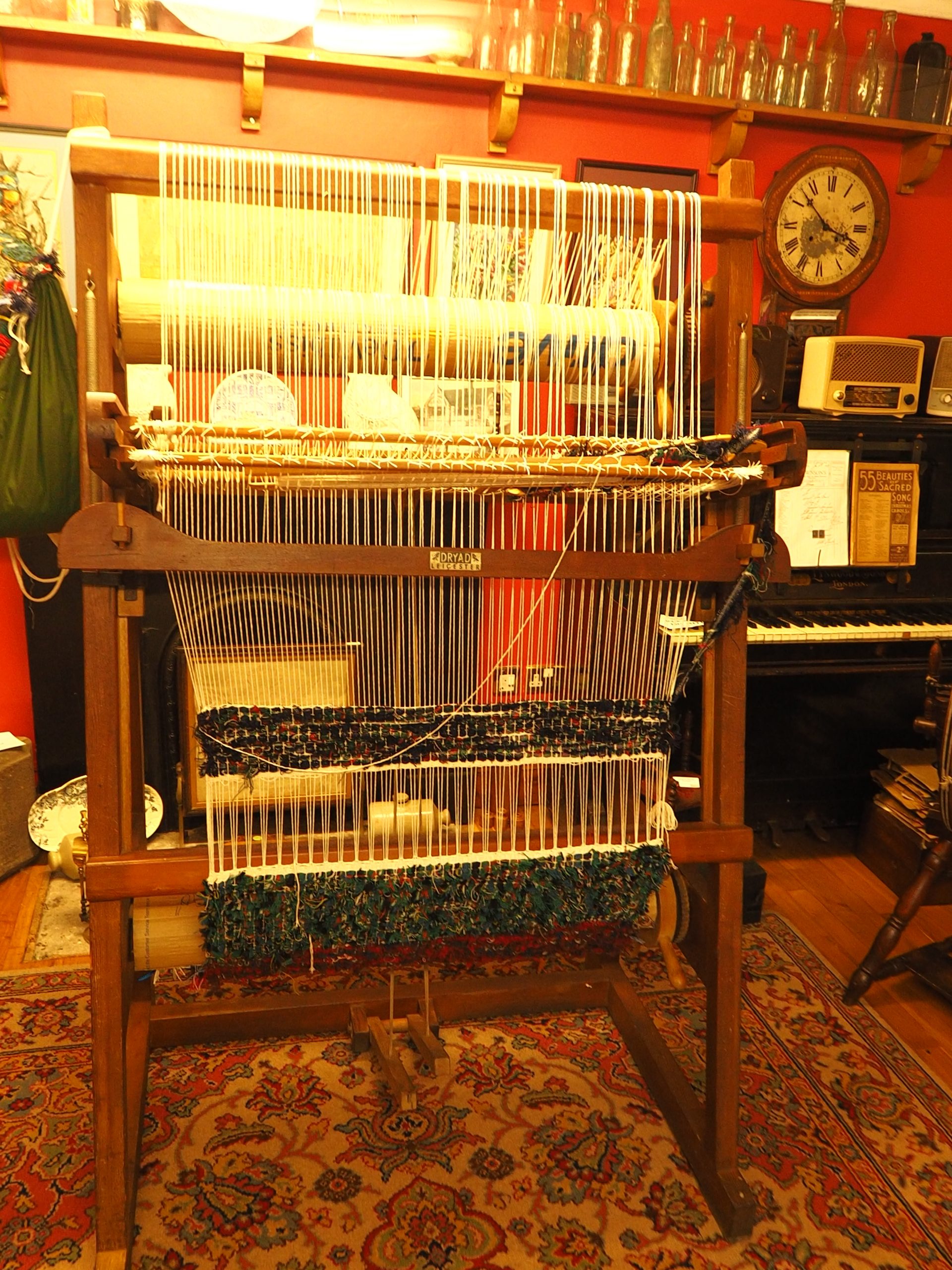 Officially “the Dryad Foot Power Rug Loom”, this is an upright design that looks at first glance a bit like a tapestry frame but it’s actually a 2-shaft floor loom stood on end so the front beam is at the bottom. The ‘A’ frame is made from pitch-pine, very strong and rigid, ideal for making big stuff like floor rugs. It’s also very access-able… the beater can be used from a chair without having to lean forwards, and the shafts can be set by hand as well as with the treadles. Nowadays I use it mostly for beginner weaving workshops. With big yarns like the selvedge waste shown here or recycled curtains weaving about 3 picks per inch, it’s possible to make a 5-foot rug in a day!