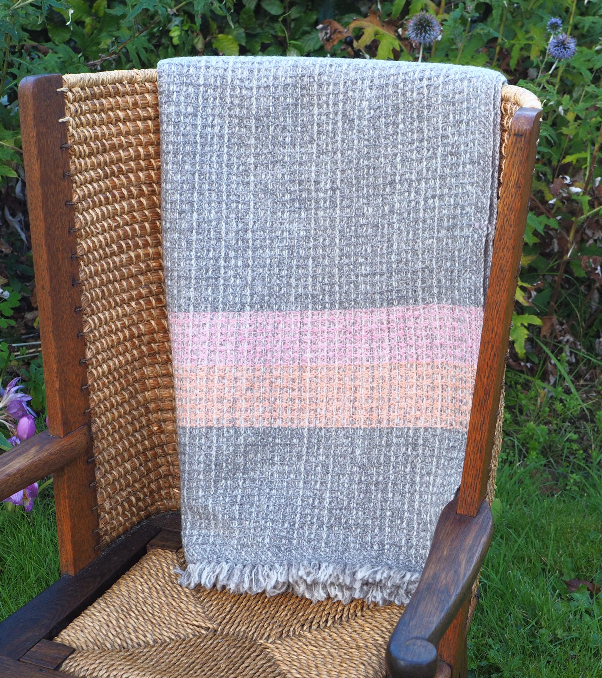 Earthy matching colours: Sholmit slate-grey body on a pebble grey / fawn warp, with a Peach and Pink pastel stripe.